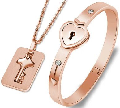 Rose Gold Heart Bracelet Choker Set Jewelry Stainless Steel Key Pendant Necklace Women Men Lover Couples Valentine's Day Gift.